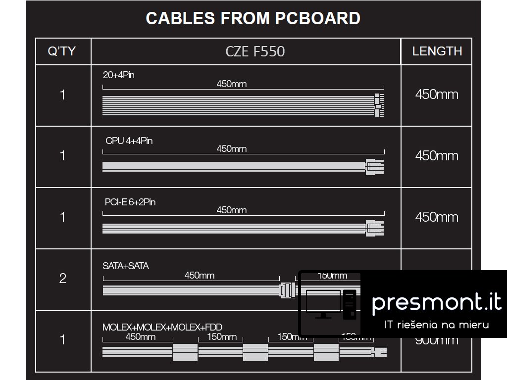 Specifikace • Ventilátor 14 cm, zelený • Aktivní PFC • Certifikace 80+ • Účinnost minimálně 82%/85%/82% při zatížení 20%/50%/100% • Ochrana proti zkratu, přetížení, přepětí a podpětí Kabeláž • 1x MB 20+4pin 450 mm • 1x cpu 4pin (8pin - 4+4) 450 mm • 1x VGA PCI-E 6+2pin 450 mm • 1x MOLEX, 450mm + MOLEX 150mm + MOLEX 150 mm + FDD 150 mm • 2x kabel S-ATA 450mm+ S-ATA150mm • černá barvaDodatočné parametre