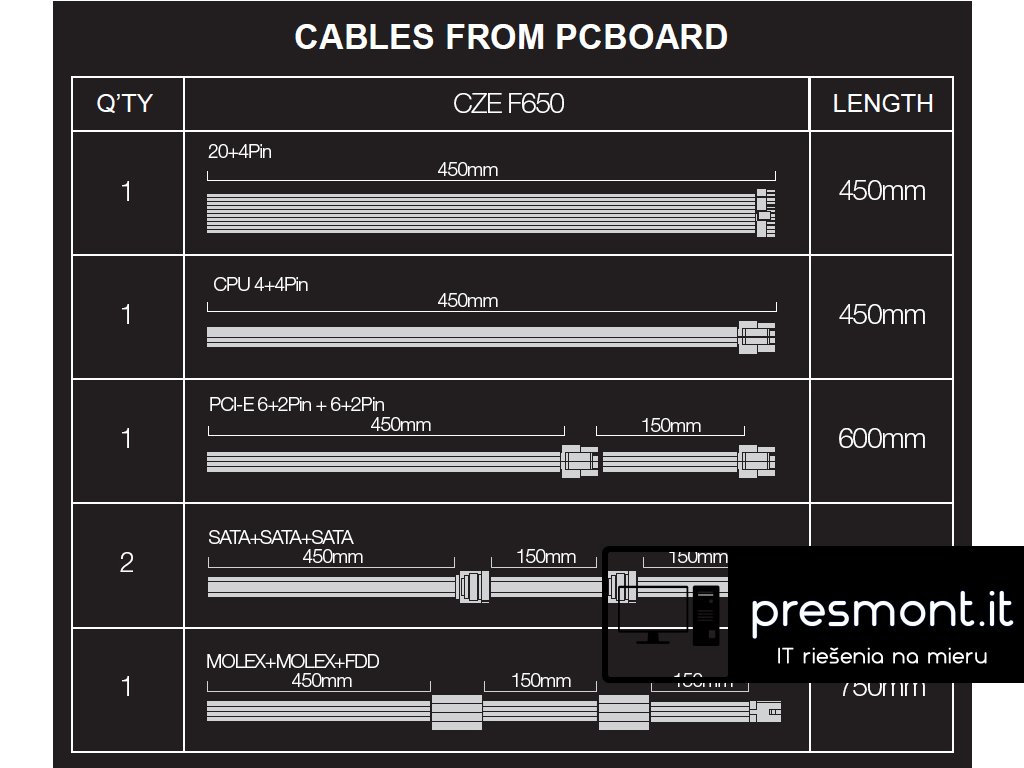 Specifikace • Ventilátor 14 cm, zelený • Aktivní PFC • Certifikace 80+ bronze • Účinnost minimálně 82%/85%/82% při zátížení 20%/50%/100% • Ochrana proti zkratu, přetížení, přepětí, podpětí a tepelná ochrana • semi-pasivní chlazení do 20% zatížení Semipasivní chlazení, ventilátor zdroje je obvykle neaktivní a spustí se pouze při překročení 20% hranice výkonu zdroje. Kabeláž • 20+4 Pin (450mm) • CPU 4+4 pin (450mm) • PCI-E (6+2) +(6+2)pin (450+150mm) • Sata+Sata+Sata (450+150+150mm) • Sata+Sata+Sata (450+150+150mm) • Molex+Molex+FDD (450+150+150mm) • černá barvaDodatočné parametre
