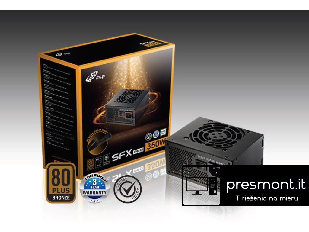 SFX PRO 450 je navržen tak, aby poskytoval co nejlepší výkon a efektivitu. Řada SFX PRO přišla na svět s misí „Never Let You Down ”, která uživatelům poskytne stylový vzhled a nejlepší herní zážitek! Navíc s 80PLUS Bronze certifikací, bezpečnou regulací certifikovanou podle IEC62368 a modulem DC-DC. Vlastnosti * Certifikace 80PLUS Bronze * Účinnost min. 85% při typickém zatížení * DC - DC modul (poskytuje vysokou účinnost a stabilní napájení) * Plochá černá kabeláž pro úsporu místa ve skříni * Inteligentní řízení rychlosti ventilátoru * PS2 montážní rámeček pro ATX skříně - umožňuje montáž zdroje do ATX, Micro-ATX nebo Mini-ITX skříní * 80mm ventilátor s inteligentním řízením otáček * Plná ochrana obvodů: OCP, OVP, SCP, OPP, OTP Technické parametry *Model: SFX PRO 450 (FSP450-50SAC) *Formát: SFX *PFC: Aktivní PFC *Ventilátor: 80mm *Rozměry: 125 x 100 x 63 mm *Účinnost: 85% *Vstupní napětí: 100-240 V *Vstupní proud: 6-2,5 A *Frekvence: 50-60Hz *Výkon: 450W *Zabezpečení: OCP, OVP, SCP, OPP, OTP Konektory *1x ATX12V 20+4 Pin *1x CPU 4+4 Pin *2x PCI-E 2.0 6+2 Pin *3x SATA *3x Molex 4 Pin *1x Floppy 4 Pin Více informací se dozvíte v přiloženém data sheetu.Dodatočné parametre